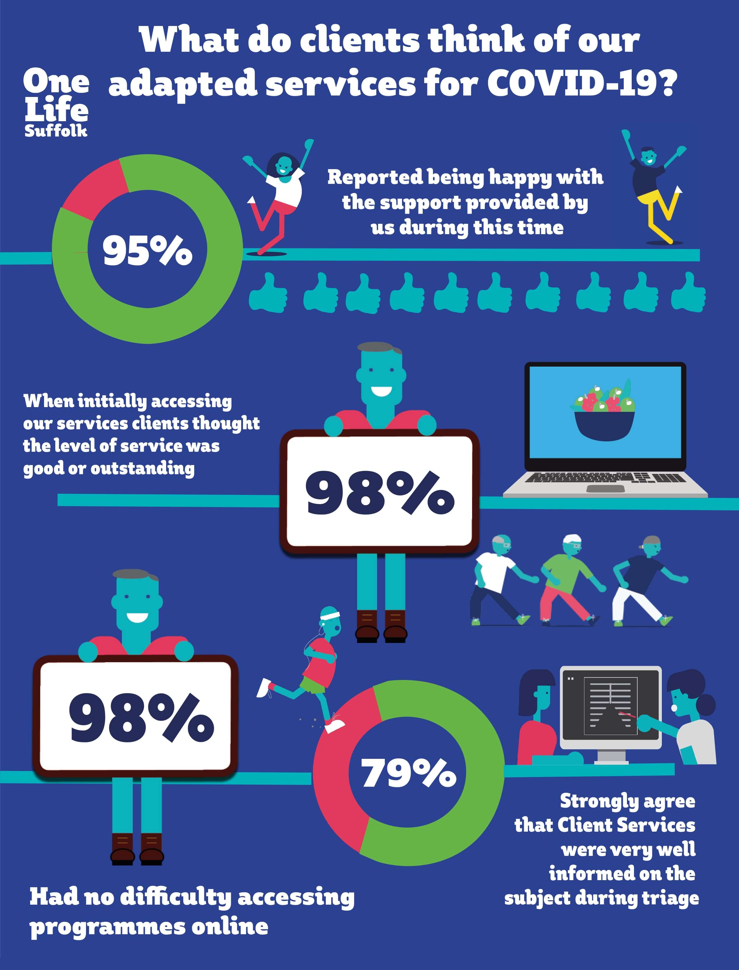 A survey of over 100 clients commissioned by OneLife Suffolk has shown that the people it supports have been fully embracing its programmes during Covid-19, with 98% of clients rating the service as good or outstanding and finding it easy to access the adapted service.