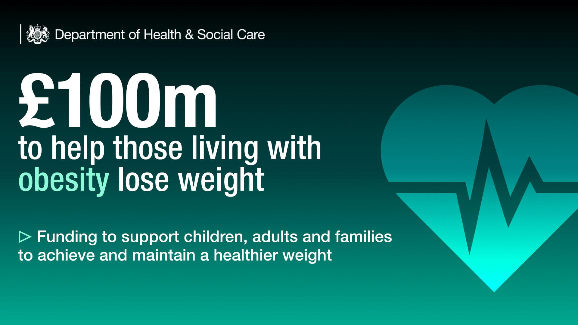 The new funding will support children, adults and families across the UK to achieve a healthier weight, alongside new incentives for GPs and healthcare professionals to encourage healthy behaviours.