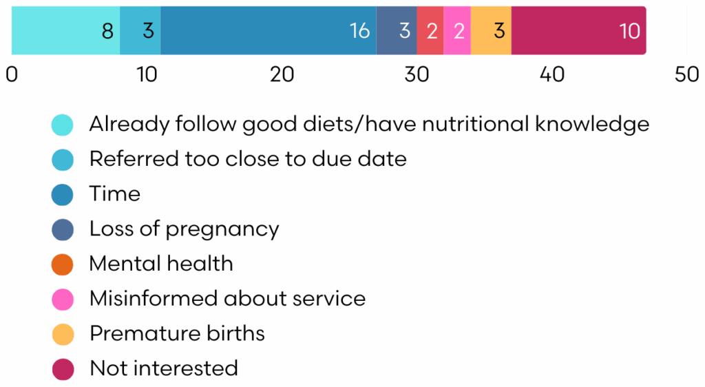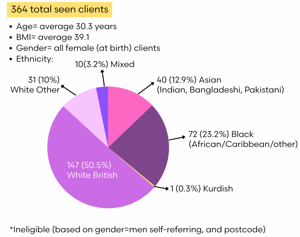 From 275 referrals received since March 2023, 63 clients completed antenatal weight tracking, and 37 provided postnatal weight tracking. Among antenatal participants, 50 (79%) maintained weight gain within the BDA-recommended range of 5–9kg. 8 clients lost weight during pregnancy, with weight changes attributed to healthy lifestyle modifications. The average weight change during pregnancy was +5.6kg, with a range from -7kg to +24kg.