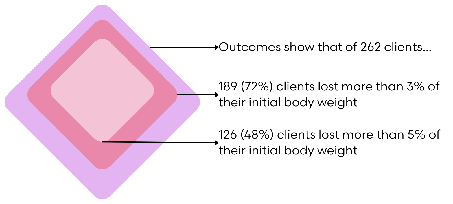 This service evaluation aims to analyse the outcomes of the MLP platform. In total, 262 (155 female, 107 male) clients completed the digital programme by engaging with the content for 12 weekly sessions and uploading their self-measured weight between weeks 8 and 12.